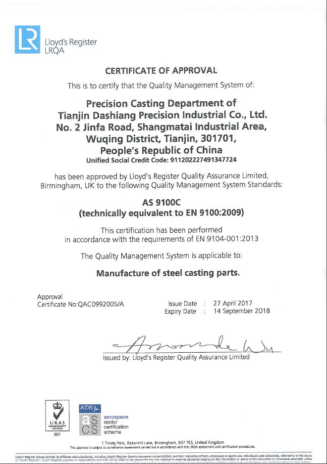 On April 27, 2017, my company for Lloyd's quality certification issued by the AS9100C aerospace quality management system certificate, enter the aerospace market for the company to be prepared for a system, also marks the company in the system of management to a new level.